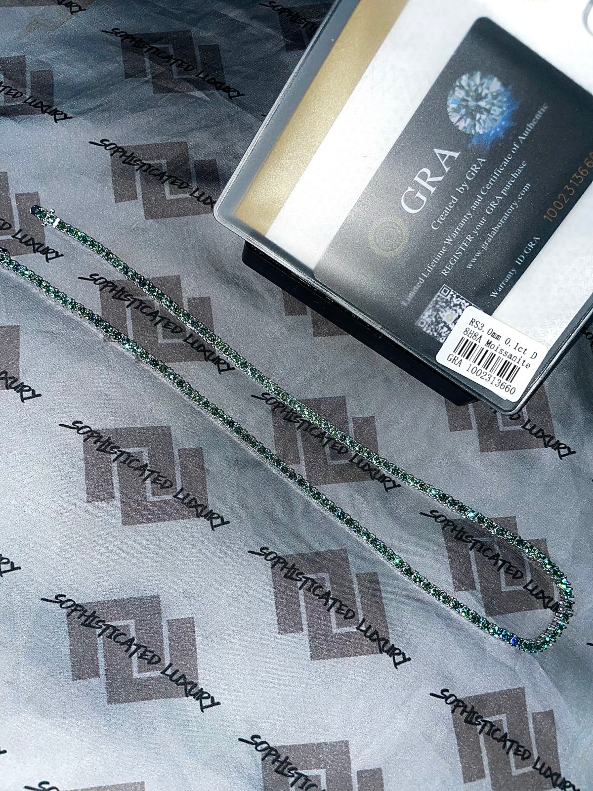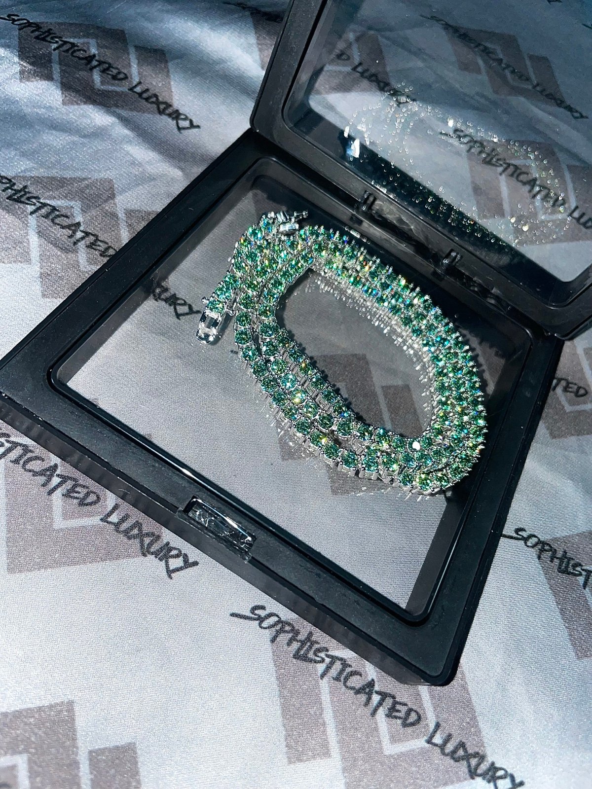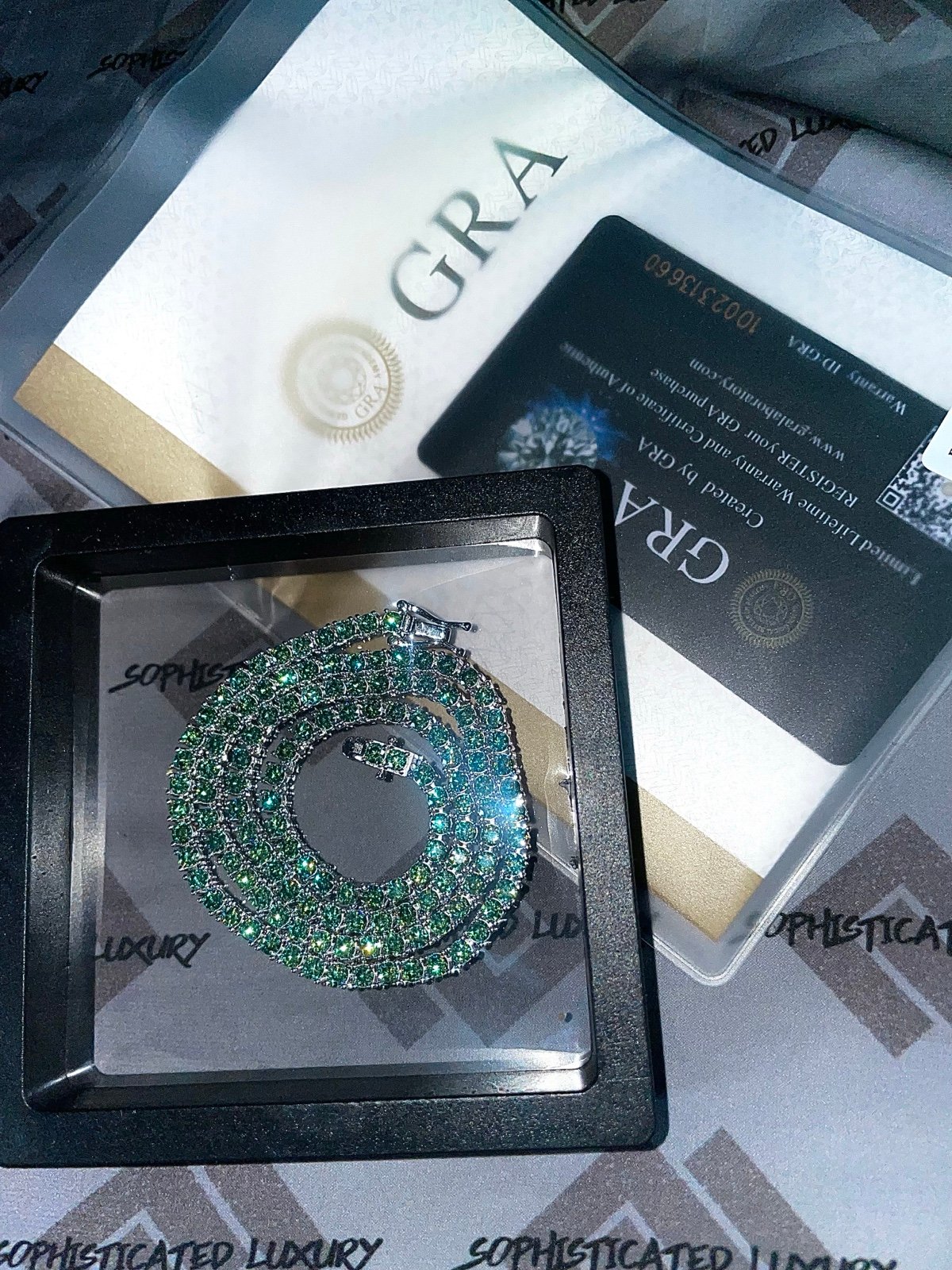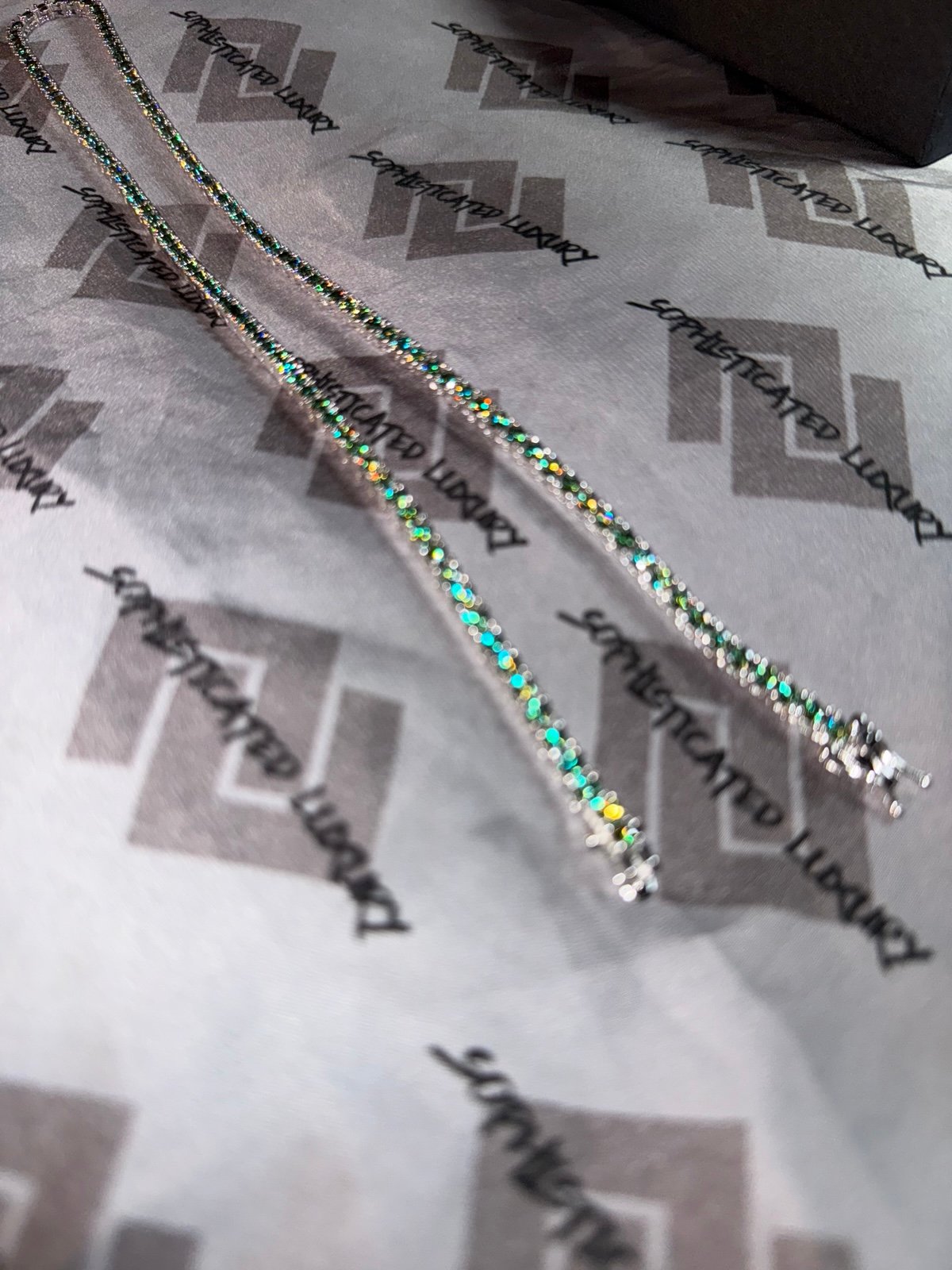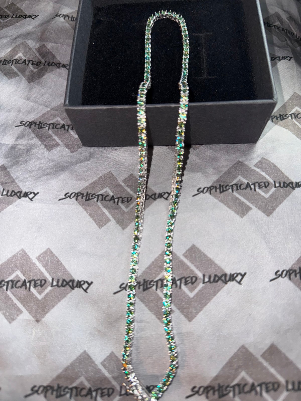 This piece of crafted art is delicate and astonishing. Blue green emerald moissanite tennis chain 3mm 18” .