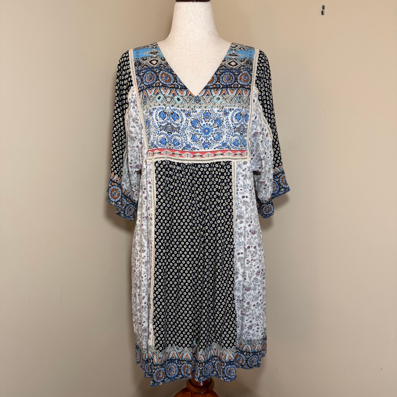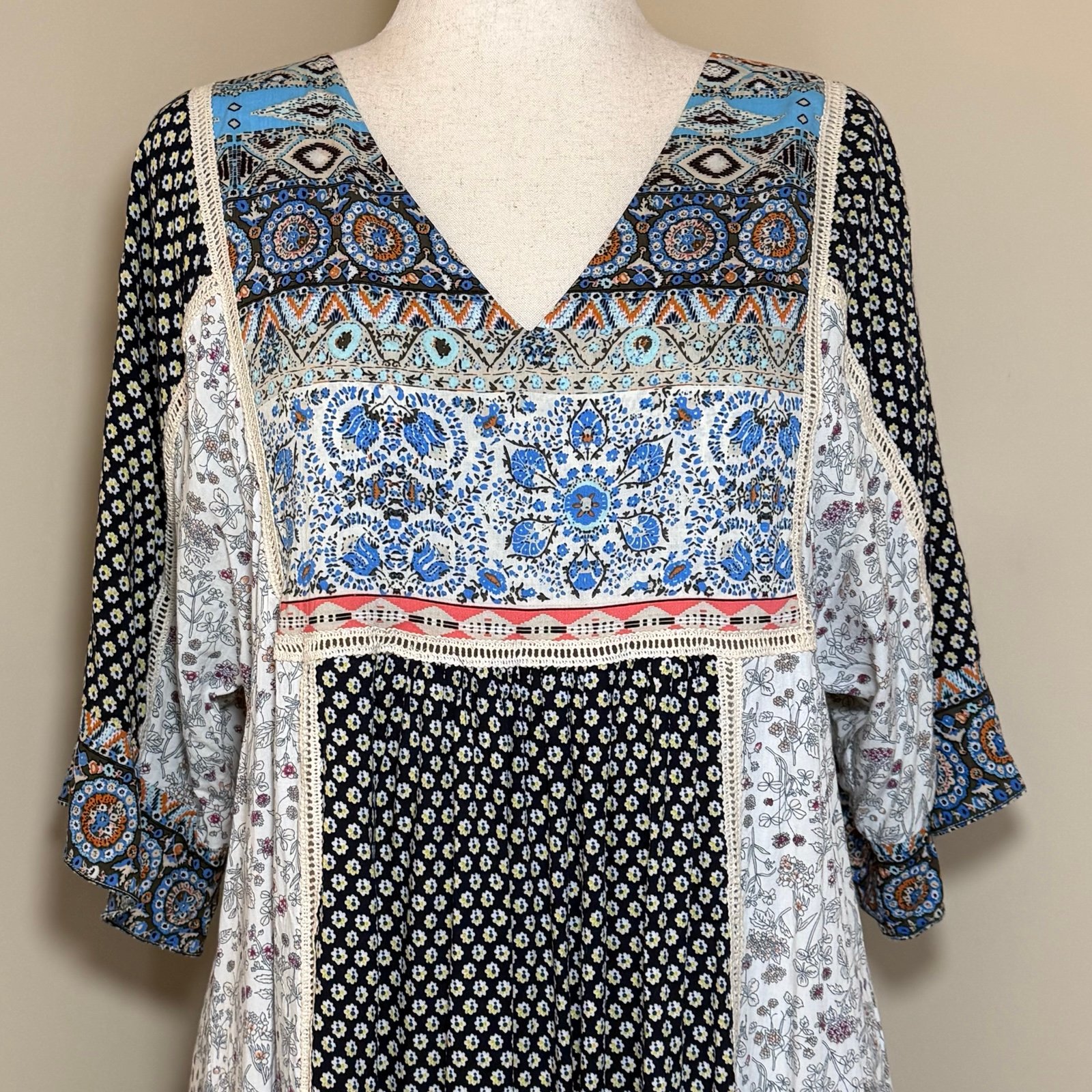 This Sundance tunic dress features a beautiful mixed-print design with bohemian flair. Made from 100% rayon, it’s lightweight and flowy, perfect for layering or wearing solo. The dress includes a V-neckline, 3/4 bell sleeves, and intricate lace trim detailing that adds a feminine touch. The multicolor patchwork pattern in blue, black, ivory, and orange gives it an artisan-inspired look typical of Sundance’s signature style.