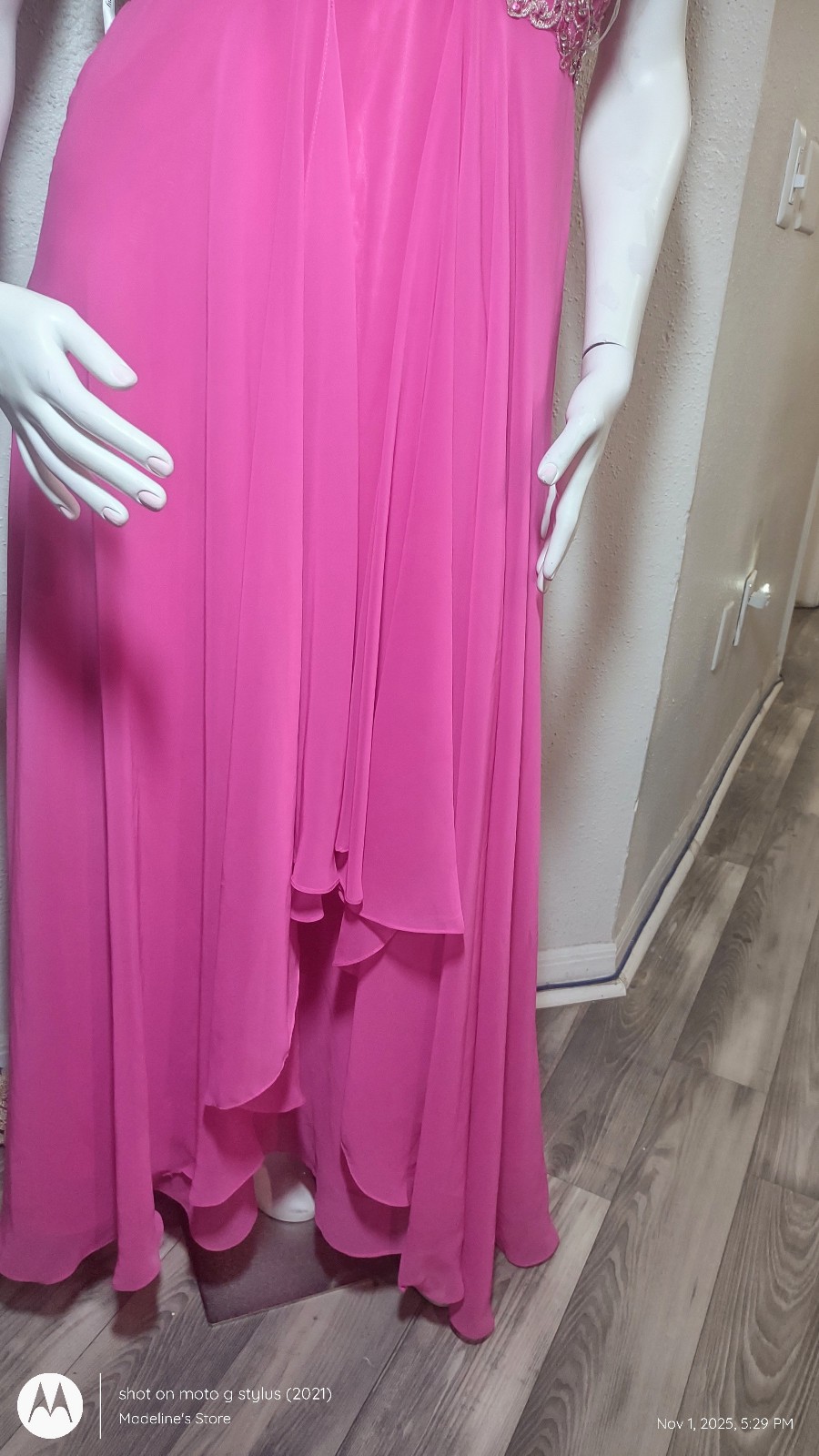 Worn once for a fund raising event and received so many compliments. It's a size 16 and the mannequin is a size 16 and the zipper only wet up halfway, probably Because the mannequin is busty and a size 38 DDD
