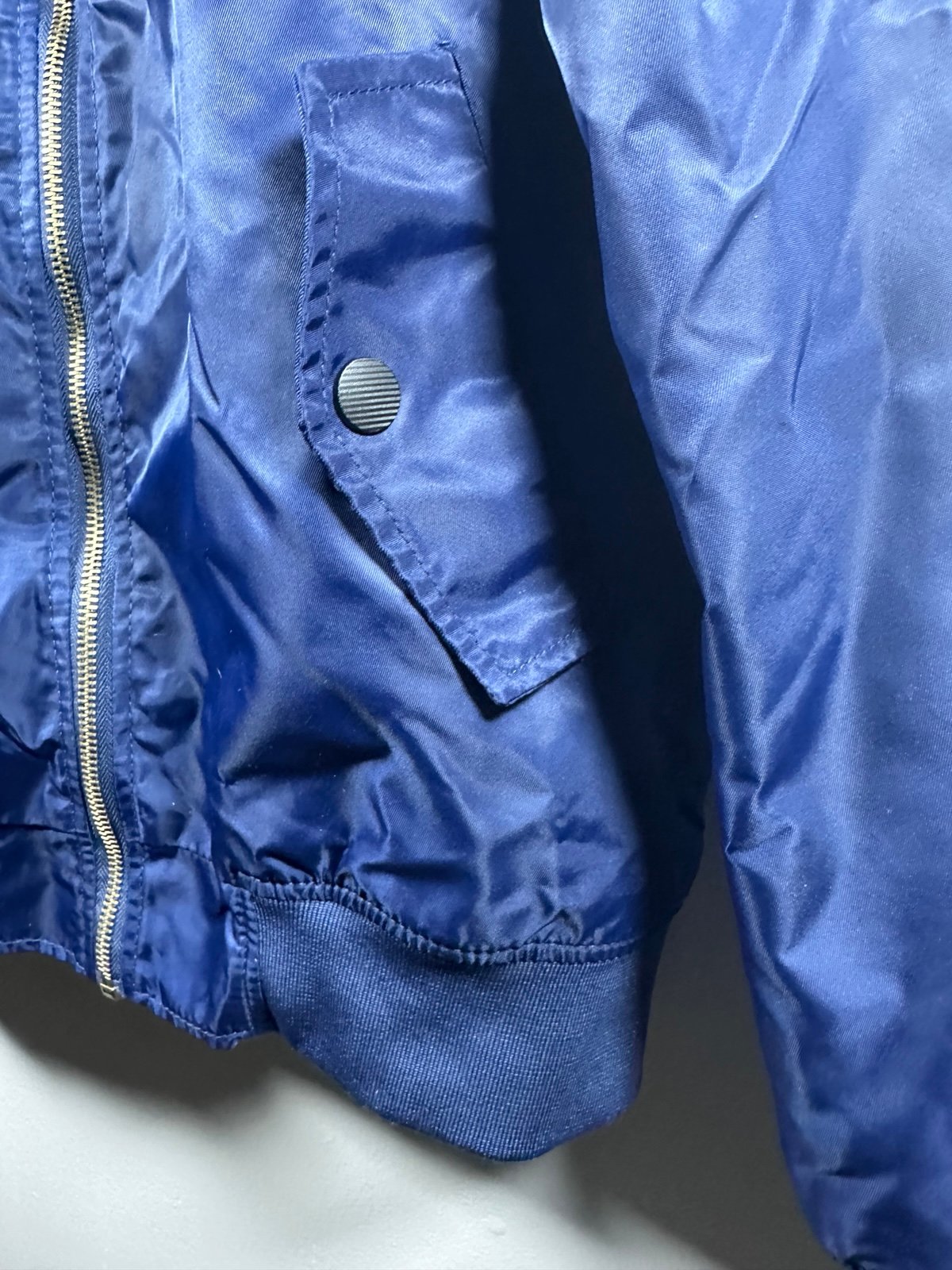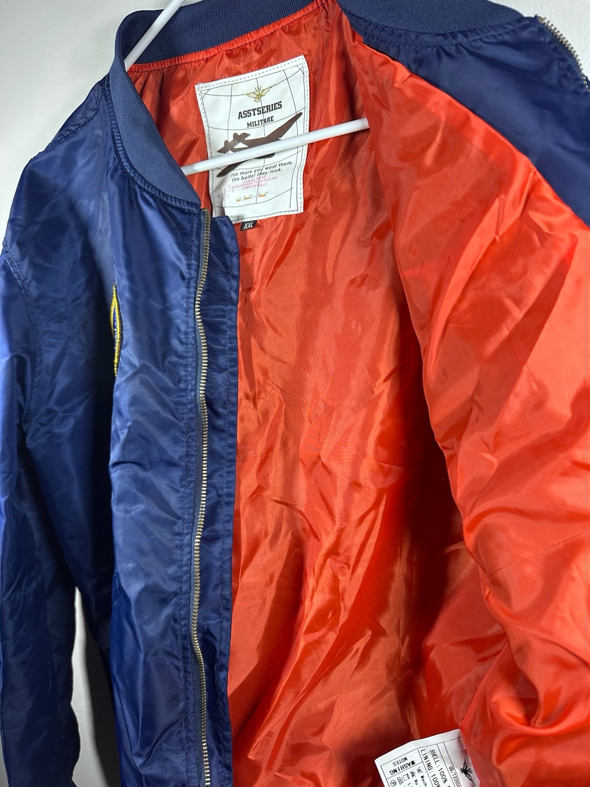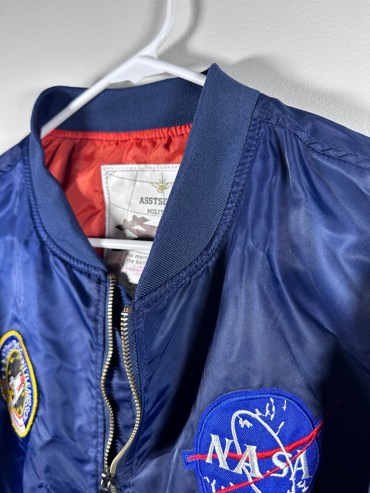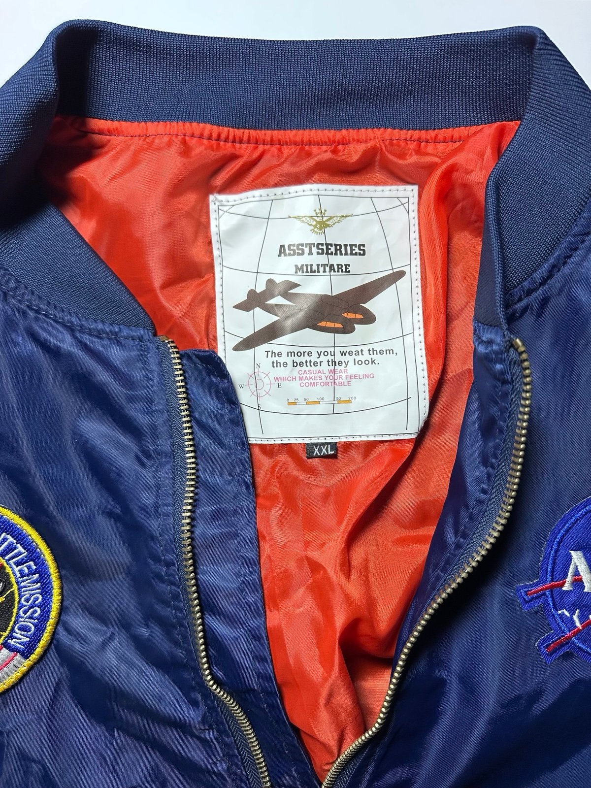 ASSTSERIES Militare NASA bomber jacket in navy blue with orange lining. Features embroidered NASA “Meatball” logo, American flag patch, and “100th Space Shuttle Mission” patch. Front zip closure with two snap pockets and sleeve utility pocket. Shell and lining are 100% polyester. Size XXL, excellent condition with no wear.