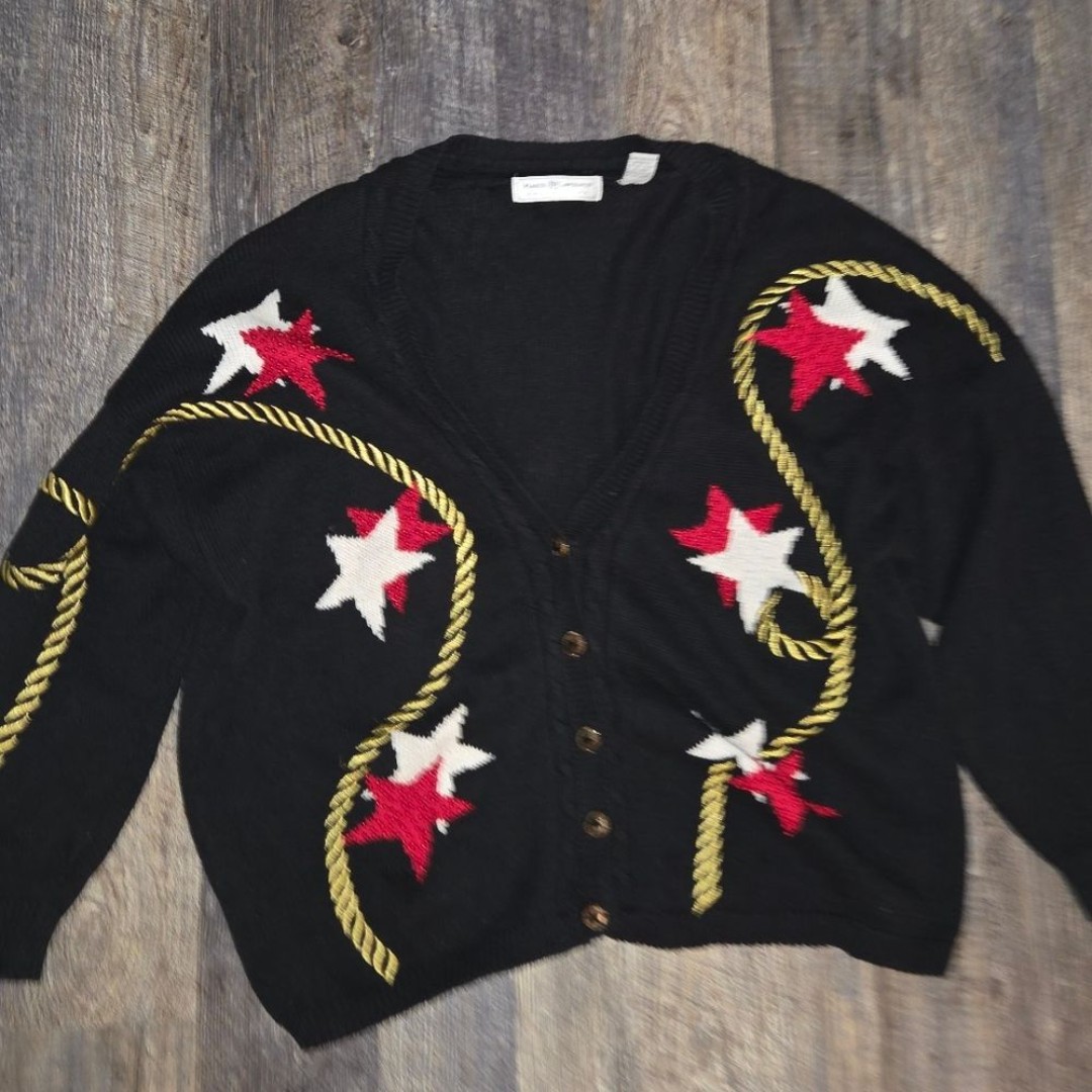 Maggie Lawrence cardigan sweater in a plus size 26/28. Black with red, white, and gold Holiday themed embroidery. Has beading on the res stars. Button Front and made of a cotton blend. Excellent condition.