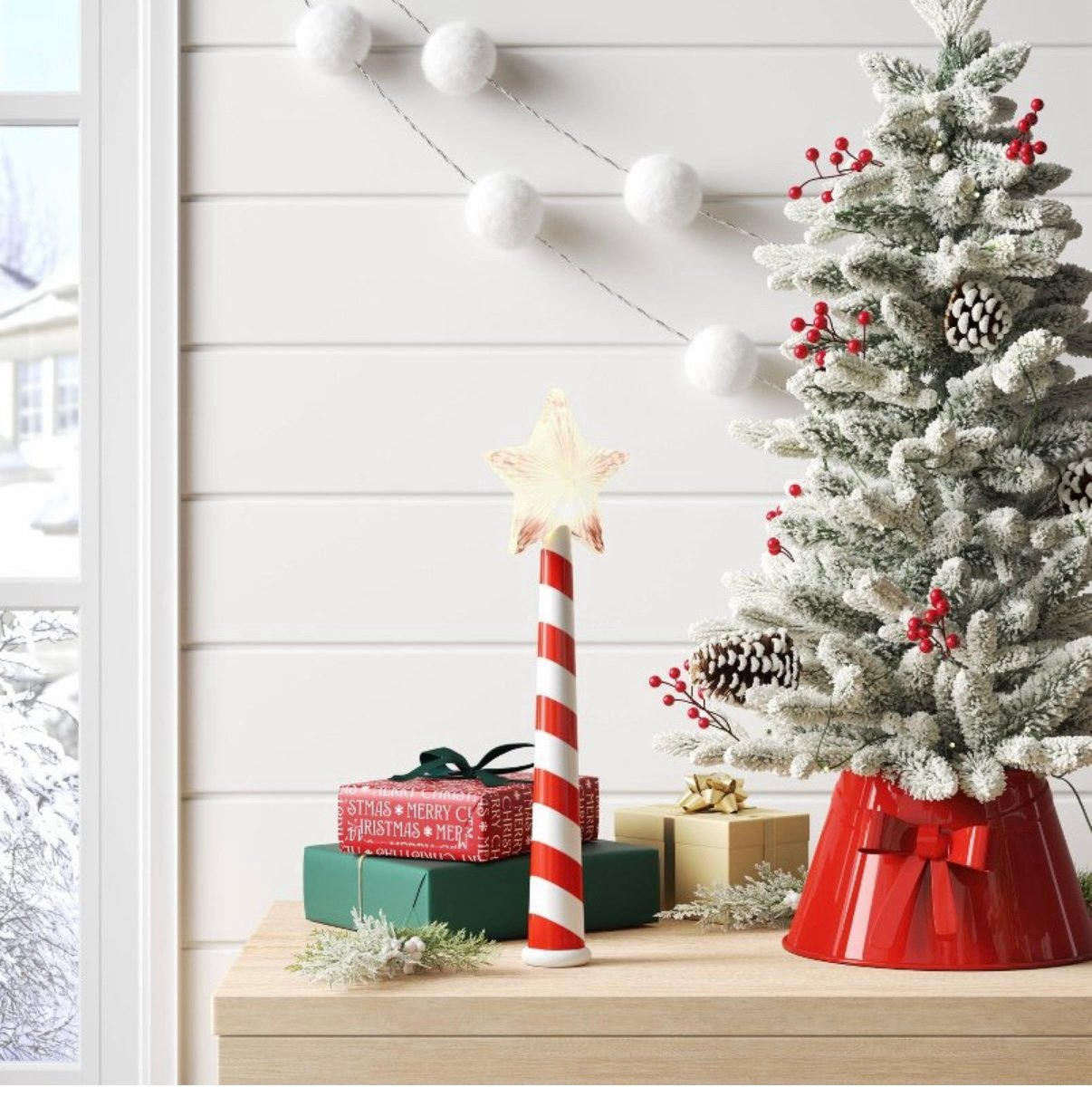 Bring a touch of magical charm to your seasonal decor with this Magic Wand Christmas Light from Wondershop™. This Christmas magic wand features red-and-white candy cane stripes and showcases a five-point star at the top. The wand plays music and the star casts a warm yellow glow with the help of the battery-operated remote. Designed for indoor use, you can place it on the tabletop or mantelpiece for festive ambience.