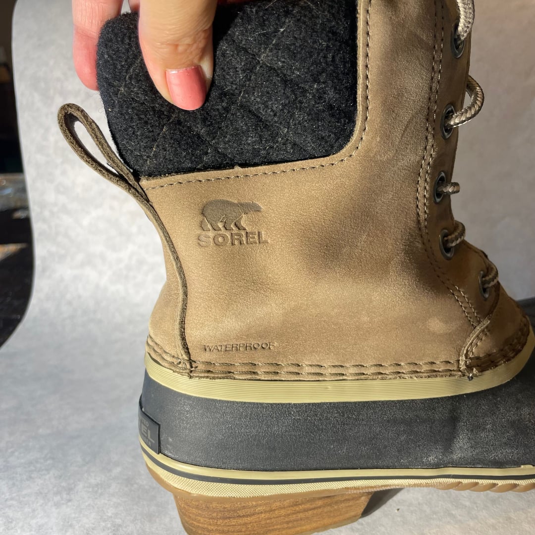 Sorel Slimpack Lace II Boots, Women's Size 10.5, in Major Brown. These waterproof boots feature a durable leather upper, cozy felt lining, and a handcrafted natural rubber shell, perfect for wet and cold conditions. Excellent pre-owned condition, with minimal wear. Ideal for fall and winter weather, offering both style and functionality.