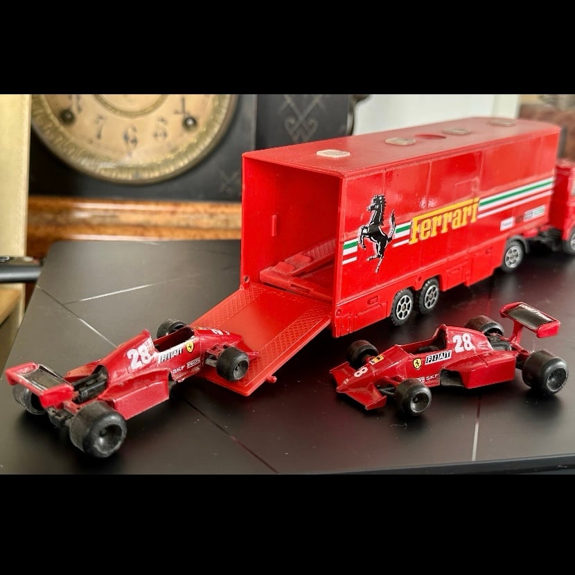 Two Ferrari 126 C3 racing cars marked number 28 in diecast metal. A 10-wheel transport truck with diecast cab and plastic trailer. Adorned with factory decals such as Fiat, Goodyear, Agip, Olivetti and others.