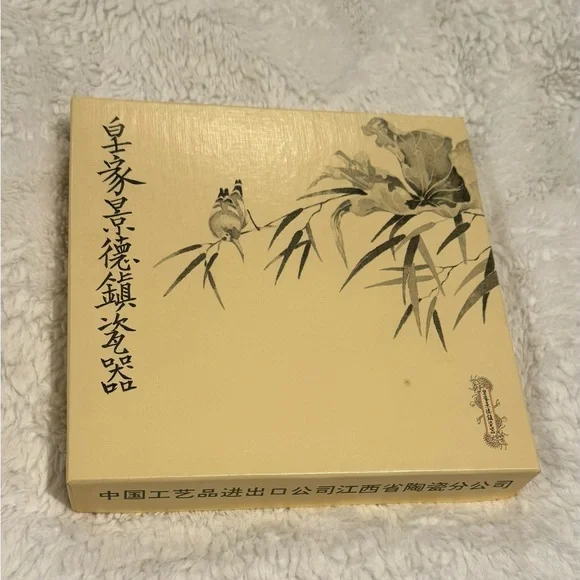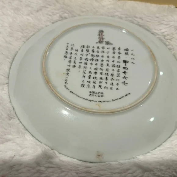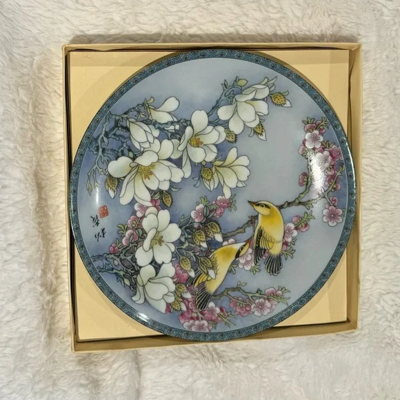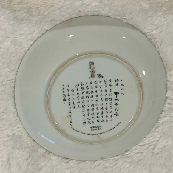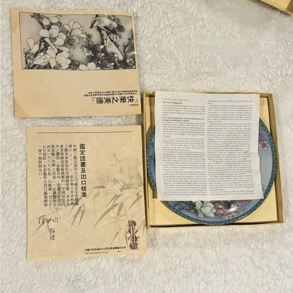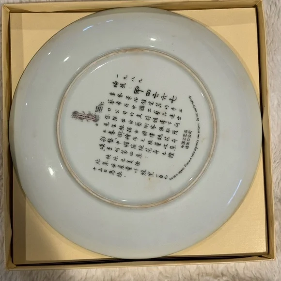 Vintage 1989 collectors plate, the 3rd issue in the Imperial Jingdezhen “Blessings From A Chinese Garden” series. The piece comes with the box and original paperwork. Plate measures 8.5”in diameter. The back of the plate has small stain that will come off with a damp rag. This plate is a discontinued item!