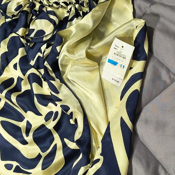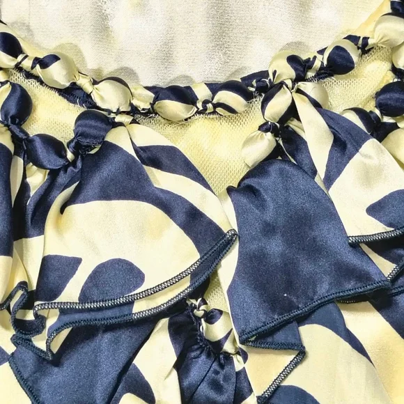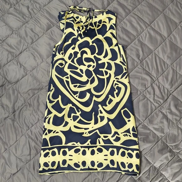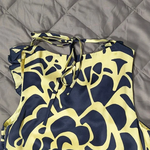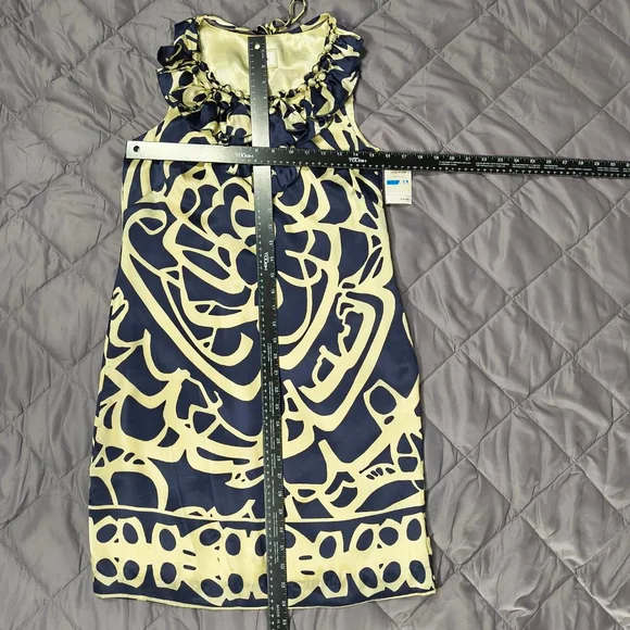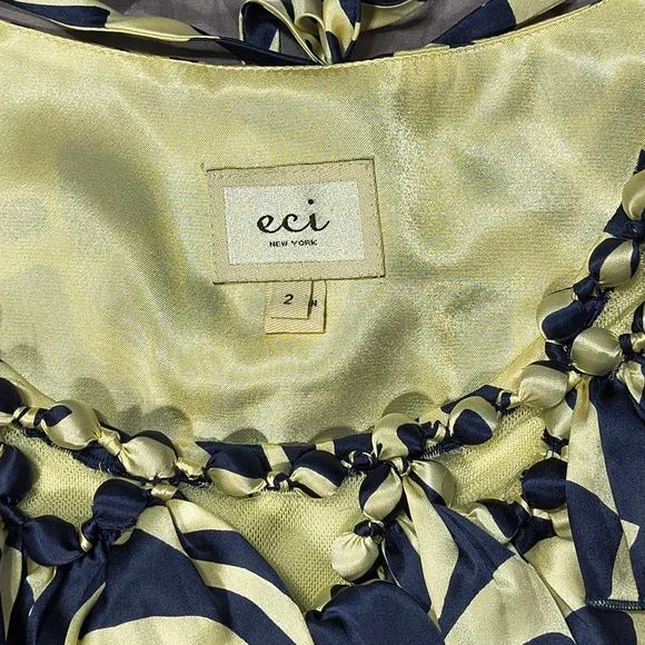 This women's ECI New York dress features a navy and yellow abstract pattern, a ruffled neckline with lace detail, and a tie at the back of the neck. It has a sleeveless design and a concealed zipper closure. NWT. Size 2.Materials:SHELL - 100% Silk LINING - 100% PolyesterApproximate Measurements:PTP - 16 inchesLENGTH - 34 inchesPlease note that color may vary due to lighting and the device you are viewing on.Feel free to ask questions! Reasonable offers accepted.Bundle to save more money!