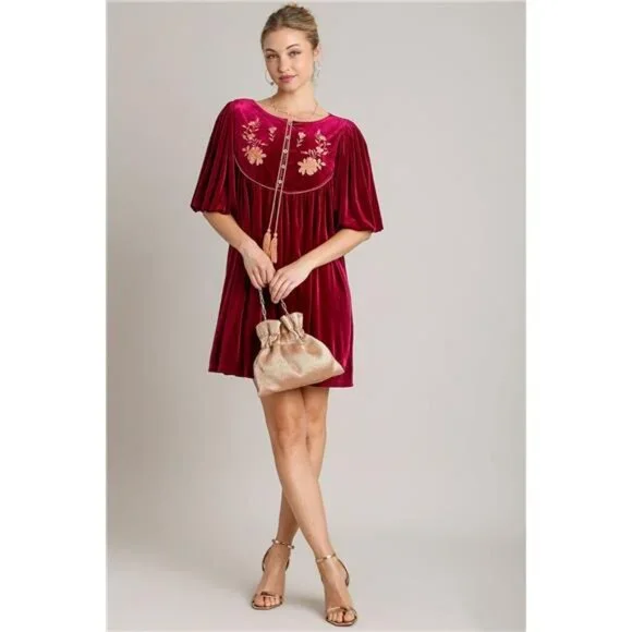 *Features: Embroidered, Basic style, Ruched*Sheer: Opaque*Stretch: Slightly stretchy*Body: Not lined*Material composition: 95% polyester, 5% spandex*Care instructions: Machine wash cold. Tumble dry low.*Imported*Product measurements:*S:Bust 35-36 in, Waist 27-28 in, HIP 36-38 in*M:Bust 37-38 in, Waist 29-31 in, HIP 39-41 in*L:Bust 39-40 in, Waist 32-33 in, HIP 42-43 inThe embroidered half sleeve velvet mini dress with tassel is a stunning and eye-catching choice for any special event. The luxurious velvet fabric and intricate embroidery detail make this dress stand out from the crowd. The tassel accents add a playful and bohemian touch to the overall look. This dress is perfect for those who want to make a statement with their outfit and exude elegance and style. Pair it with your favorite heels and accessories for a chic and sophisticated ensemble.The embroidered half sleeve velvet mini dress with tassel is a stunning and eye-catching choice for any special event. The luxurious velvet fabric and intricate embroidery detail make this dress stand out from the crowd. The tassel accents add a playful and bohemian touch to the overall look. This dress is perfect for those who want to make a statement with their outfit and exude elegance and style. Pair it with your favorite heels and accessories for a chic and sophisticated ensemble.