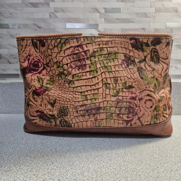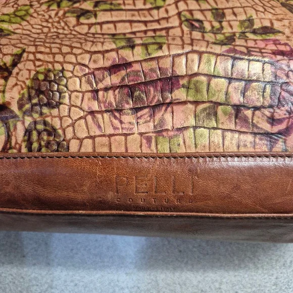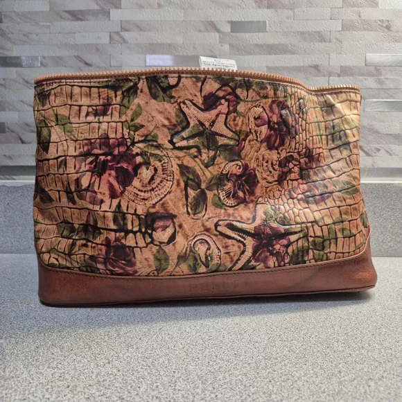This is a pre-owned Pelli Couture reversible cover. It features a black ostrich leather exterior with a brown Italian vegetable leather trim. The cover has a zipper closure. The interior is a floral pattern. The item shows signs of wear consistent with pre-owned condition, including minor scuffs and creases on the leather.
