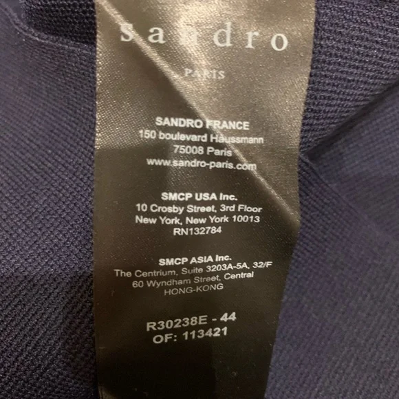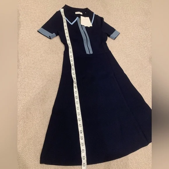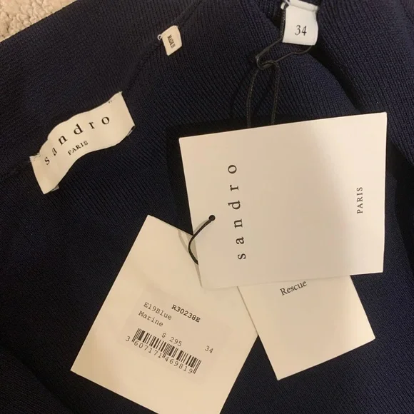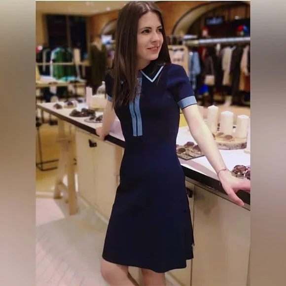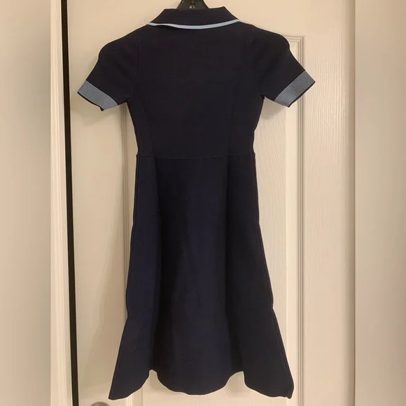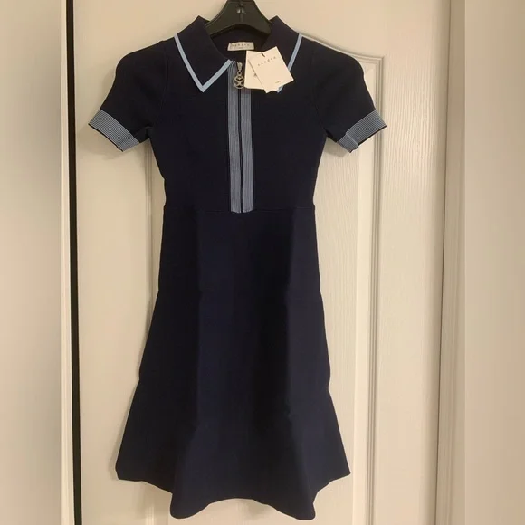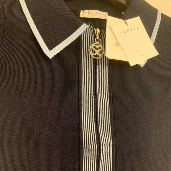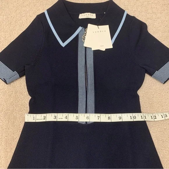 Conditions:New with tagMeasurements in inches Product Details •Designed for a slim fit•Model measurements: 5'10" height, 33.5" bust, 23.5" waist, 34.5" hips, wearing a Sandro size 36•Spread collar with contrast-tipping•Short sleeves with striped trim•Front half-zip closure with striped trim and logo zipper pull•Seamed high waist•A-line skirt silhouette•Pullover style•54% viscose, 44% polyamide, 2% elastane •Hand wash or dry clean