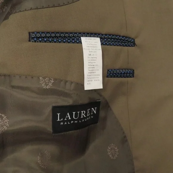 Description: NWOT Lauren Ralph Lauren LRL 100% Wool Natural Stretch Black Label Blazer Sport Coat Jacket-Two button closure-Two front flap pockets-Left chest pocket-Double vented back-Four button cuffs-Notch collar-Natural stretch-Black labelSize (Check Measurements): Mens 46 RColor: Light brownFabric: 70% wool and 30% polyesterCondition: New Without TagsItem#: 67236Measurements are in inchesArmpit to armpit: 23 3/4"Back bottom of the collar to the hem: 30 3/4"Shoulder to shoulder: 20 1/2"Shoulder seam to end of cuff: 24 1/2BUYING VINTAGE·We do our best to thoroughly inspect all items for any visible imperfections i.e., rips, repairs, holes, stains, etc. and note as such.·Please note vintage sizes are not always comparable to today's sizing. Please refer to the measurements in the description for a more accurate depiction of the true size. If an issue should arrive, please contact us prior to leaving a negative as we strive for providing excellent customer service.Please compare your measurements to the measurements provided in the listing description to ensure a proper fit. 65149