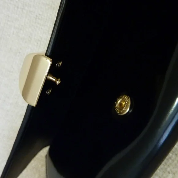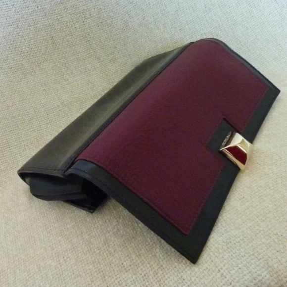 Cortina wallet/clutch by Furla™.This wallet is made of black and burgundy leather.Gold tone hardwareDimensions: 7 3/4" widest x 3 3/4" tall x 1 1/4" deep.Flap and snap button closure.Fabric interior lining with a zipped center coin compartment6 credit card slots3 bills and receipt compartmentIt's in solid black patent leather and full grain burgundy leather.Comes complete with it's dustbag, card and tag
