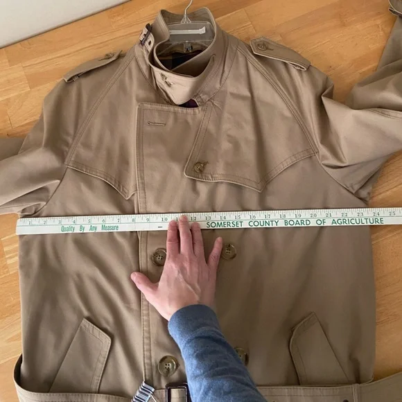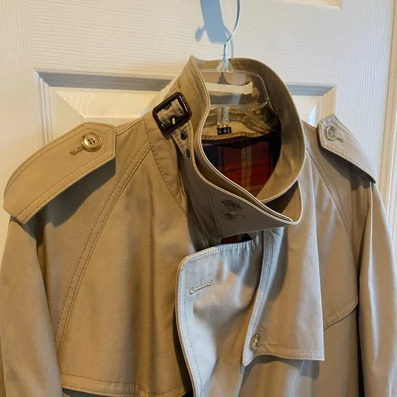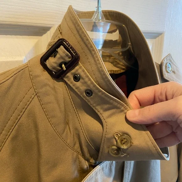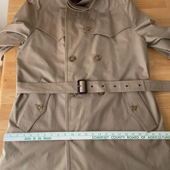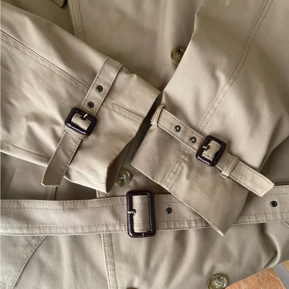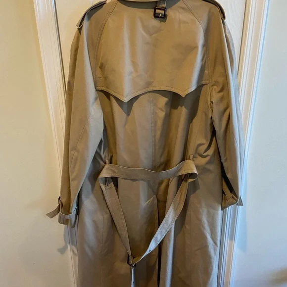 Elevate your style with this classic beige trench coat. Perfect for any occasion, this coat offers both elegance and functionality.DOES NOT come with removable linerSee approximate measurements flat in pics.Buyer pays shipping. Feel free to ask any questions. Pics are a part of the description. Thanks for shopping!