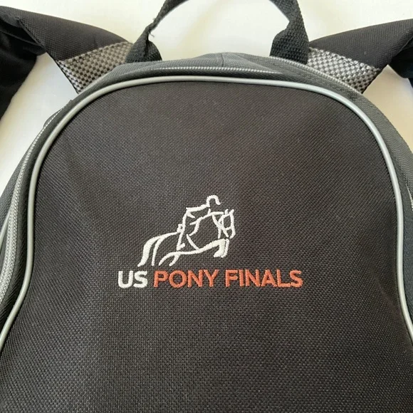 Excellent pre-loved condition!Used briefly, if at all.Atchison brand medium backpack in black and grey with US PONY FINALS logo embroidered on the front.Backpack depth is somewhat triangular in shape, and can also be used as a helmet bag (it will accommodate the larger brimmed Miss Shields helmet).Adjustable padded shoulder straps.main component has two-zipper closure with one small slip pocket inside.Front compartment has two-way zipper closure and slip pocket for phone.There is a small outlet on the exterior for accommodating wired headphones. Exterior also has one small mesh pocket on the side. All zippers function properly.Backpack has been cleaned/wiped down.There are a few dust-like marks on the interior from an unknown source. No other issues found. May have light marks, dust and lint from handling.Measurements in photos.Cross listed under kids accessories due to relevancy, but only one backpack is available. New to ? Create an account with referral CrickettsCache and receive a $10 credit towards your first purchase! Signing up is free!