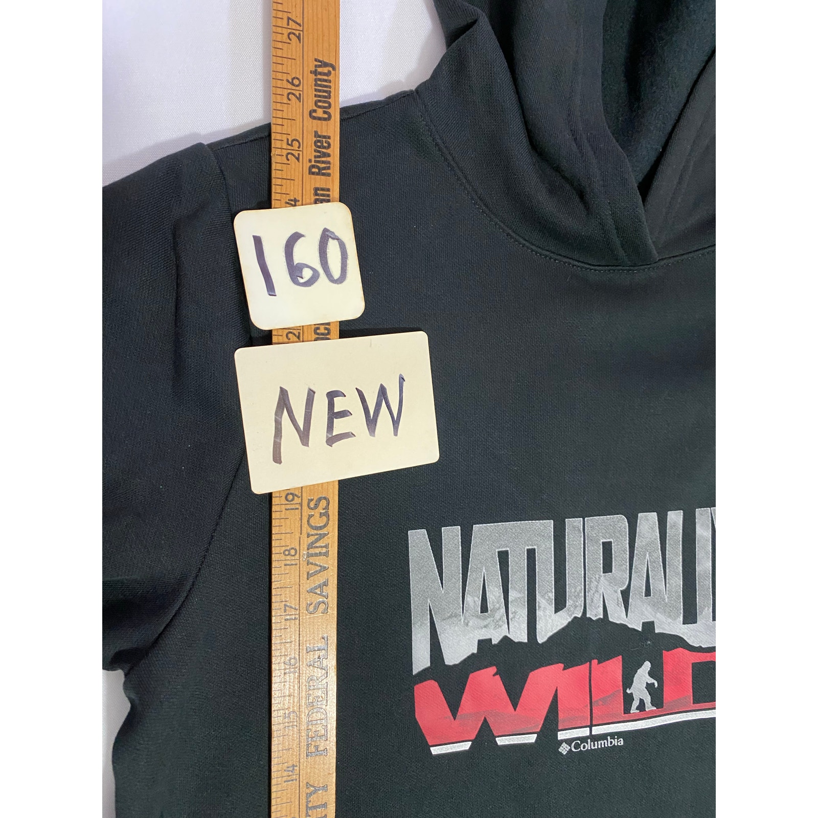 Columbia youth pullover hoodie in black featuring a fun Sasquatch graphic. Tagged Youth XL. Soft fleece interior with classic hooded design, long sleeves, and durable Columbia quality. Great for everyday wear, outdoor adventures, or young fans of Bigfoot‑themed apparel. MSRP $34.99.